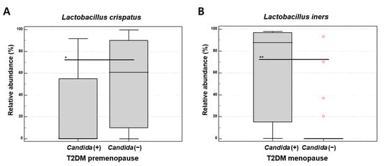 Relative abundance of Lactobacillus species by Candida infection status in women with T2DM. (A) Decreased L. crispatus in Candida-positive premenopausal women. (B) Increased L. iners in Candida-positive menopausal women. Non-parametric test; p < 0.05 (*), p < 0.01 (**).