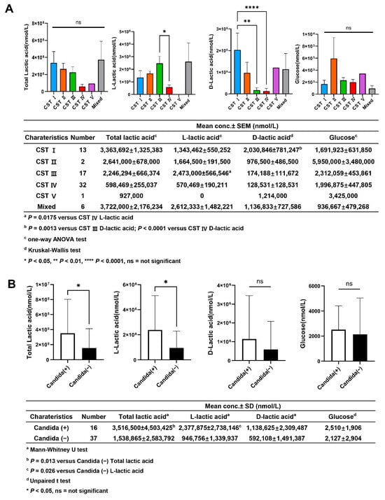 Vaginal lactic acid and glucose concentrations in women with T2DM, according to CST and Candida infection status. (A) L-lactic acid highest in CST III; D-lactic acid highest in CST I (p < 0.05). No difference in total lactic acid or glucose. (B) Higher total and L-lactic acid in Candida-positive vs. Candida-negative (p = 0.013, 0.026). No difference in D-lactic acid or glucose. Non-parametric test; p < 0.05 considered significant.