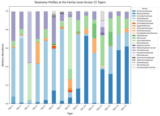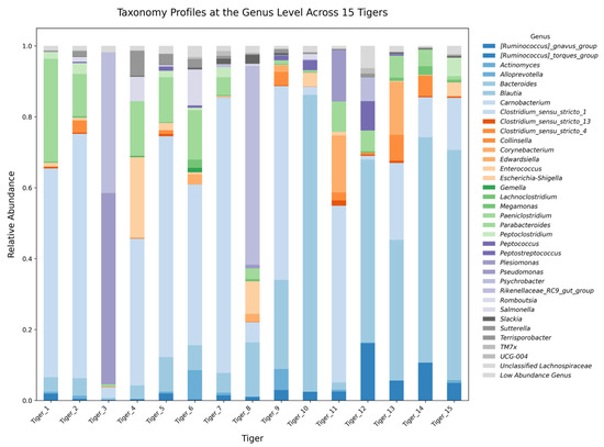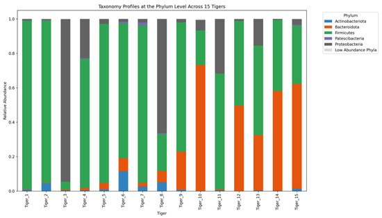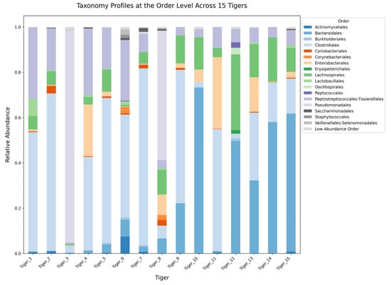 APA StyleKim, B., Lee, S., Lee, Y.-J., Kang, Y.-M., Rhee, M. H., Kwak, D., Yeo, Y.-G., Kang, J. W., Kim, T., & Seo, M.-G. (2025). Preliminary Insights into the Gut Microbiota of Captive Tigers in Republic of Korea: Influence of Geographic and Individual Variation. Microorganisms, 13(6), 1427. https://doi.org/10.3390/microorganisms13061427