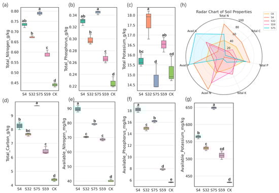 The effects of the different treatments on the soil physicochemical properties. The boxplots illustrate the variations in the (a) total nitrogen, (b) total phosphorus, (c) total potassium, (d) total carbon, (e) available nitrogen, (f) available phosphorus, and (g) available potassium contents across the different treatment groups (S4, S32, S75, S59, and CK). Each box represents the interquartile range, the horizontal line indicates the median, and the whiskers represent the data range. A radar chart (h) summarizes the relative levels of key soil properties under all treatments. The S75 group exhibited generally higher levels of available nutrients compared with the control (CK), suggesting a potential enhancement of soil fertility under this treatment. The letters above the boxes indicate statistically significant differences between the treatments (p < 0.05). Different letters denote significant differences based on the Kruskal–Wallis test, followed by Dunn’s multiple comparisons test. The total phosphorus, available phosphorus, and available potassium parameters were analyzed using ANOVA followed by Tukey’s HSD test.