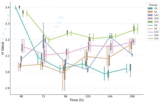 The temporal dynamics of the soil microbial functional diversity (Shannon index) under the different treatments. The boxplot–line charts illustrate the temporal changes in the Shannon index (H-value) of the soil microbial communities under the different treatments (CK, S4, S32, S59, and S75) over a 168 h incubation period. Each line represents the trend of the H-values across the time points, with the endpoints marked by short bars corresponding to the range of the boxplot data, indicating the mean ± standard deviation.