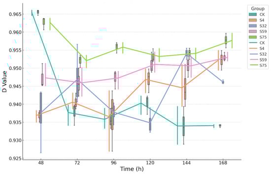 The temporal changes in the Simpson diversity index (D-value) of the soil microbial functional profiles under the different treatments. The combined boxplot–line graphs depict the dynamic changes in the Simpson diversity index (D-value) over a 168 h incubation period across the five treatment groups (CK, S4, S32, S59, and S75). Each point on the line represents the mean ± standard deviation, corresponding to the interquartile range shown in the boxplot at each time point. A higher D-value indicates greater functional evenness and lower dominance within the microbial community.