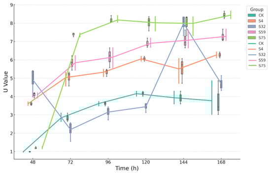 The temporal changes in the McIntosh diversity index (U-value) of the soil microbial functional communities under the different treatments. The combined boxplot–line graphs illustrate the changes in the McIntosh diversity index (U) over a 168 h incubation period across the five treatment groups (CK, S4, S32, S59, and S75). The data are presented as means ± standard deviations. A higher U-value indicates greater overall functional heterogeneity and a more balanced distribution of microbial abundance.