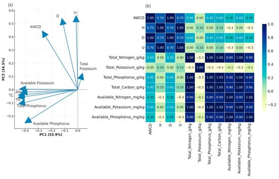 The principal component analysis (PCA) and correlation analysis between soil physicochemical properties and microbial diversity indices. (a) The PCA biplot illustrates the relationships between the soil physicochemical variables and the microbial diversity indices under the different treatments (CK, S4, S32, S59, and S75). The arrows indicate the direction and magnitude of each variable’s contribution to the first two principal components (PC1 and PC2), which explain 53.9% and 34.5% of the total variance, respectively. AWCD: average well color development; H: Shannon index; D: Simpson index; AN: available nitrogen; TN: total nitrogen. (b) The heatmap of the Pearson correlation coefficients between the microbial diversity indices and the soil chemical properties (total nitrogen, phosphorus, potassium, and carbon). The color intensity represents the strength of the positive or negative correlations, with the corresponding values displayed in each cell. AWCD shows a positive correlation with most soil nutrients, especially the available nutrients. AWCD: average well color development; H: Shannon index; D: Simpson index; U: McIntosh index.