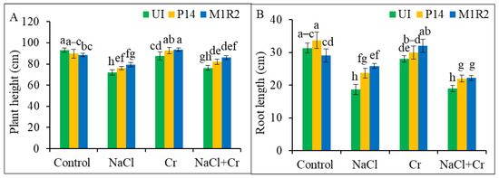 Under NaCl, Cr, and NaCl + Cr stress, shoot FW declined by 62, 23, and 48%, respectively, while shoot DW dropped by 48, 56, and 19%, compared to unstressed controls (Figure 2A,B). Inoculation with P14 and M1R2 significantly improved both shoot FW and DW under stress conditions. The enhancements observed were statistically similar between the two strains across all treatments (Figure 2A,B). Likewise, root FW decreased by 56, 31, and 66%, and root DW by 77, 32, and 82%, under NaCl, Cr, and NaCl + Cr stress, respectively, compared to the control (Figure 2C,D). The PGPR treatment mitigated these reductions, with strain M1R2 showing superior performance. In particular, M1R2 increased root FW by 66, 32, and 97%, and root DW by 200, 27, and 165%, under NaCl, Cr, and NaCl + Cr stress, respectively, compared to corresponding uninoculated stressed plants (Figure 2C,D). The effect of M1R2 was calculated by comparing it to uninoculated NaCl-treated plants. Similar methods are used to compare other treatments. These results indicated that PGPR inoculation increase plant biomass that was greater than the non-PGPR treatment under NaCl, Cr, and NaCl + Cr stresses.