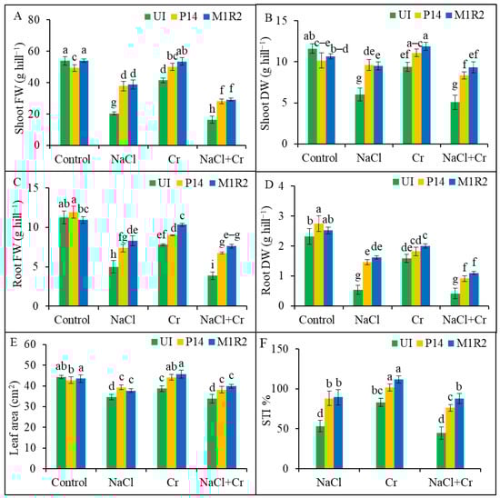 Similarly, leaf area was significantly reduced in uninoculated plants under NaCl, Cr, and NaCl + Cr stress by 21, 13, and 24%, respectively (Figure 2E). However, inoculation with P14 and M1R2 improved leaf area under all stress conditions. Specifically, leaf area increased by 14 and 9% (NaCl), 14 and 18% (Cr), and 13 and 18% (NaCl + Cr) with P14 and M1R2, respectively, compared to the uninoculated stressed counterparts (Figure 2E). The differences between the strains were not statistically significant. As shown in Figure 2F, the STI was lowest in uninoculated rice plants under all stress treatments. Plant growth-promoting rhizobacteria inoculation significantly enhanced STI values by 65% (P14) and 68% (M1R2) under NaCl, 22 and 34% under Cr, and 70 and 96% under NaCl + Cr stress, respectively, compared to the corresponding uninoculated stressed plants. Notably, the endophytic strain M1R2 outperformed the epiphytic strain P14 in boosting STI under all stress conditions. The results indicated that the lower the STI value, the greater the toxic effects of NaCl, Cr, and NaCl + Cr on rice plants. These results indicated that the higher the STI values, the lower the toxic effects of NaCl, Cr, and NaCl + Cr on rice plants.