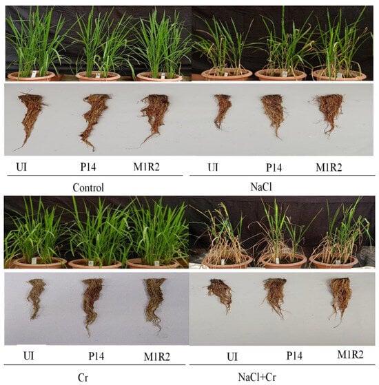 The phenotypic appearance of rice plants under various treatments is shown in Figure 3. It is evident that plant growth was visibly hampered under NaCl, Cr, and combined NaCl + Cr stress in the absence of bacterial inoculation. In contrast, inoculation with P14 and M1R2 effectively alleviated the osmotic stress induced by these treatments. As a result, plants treated with the bacterial strains exhibited improved growth and vigor compared to their uninoculated, stressed counterparts (Figure 3).