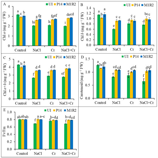 Effect of bacterial inoculation on photosynthetic pigments and chlorophyll fluorescence in rice plants (65 DAT) under NaCl, Cr, and combined NaCl + Cr stress conditions. Panels represent: (A) Chlorophyll a (Chl a), (B) Chlorophyll b (Chl b), (C) Total chlorophyll (Chl a + b), (D) Carotenoid content, and (E) Maximum quantum efficiency of PSII (Fv/Fm). Each column represents the mean ± standard deviation (SD) of three biological replicates. Error bars indicate the least significant difference (LSD) at a 5% level of significance. Different letters indicate statistically significant differences between treatments at p < 0.05, UI = Uninoculated.