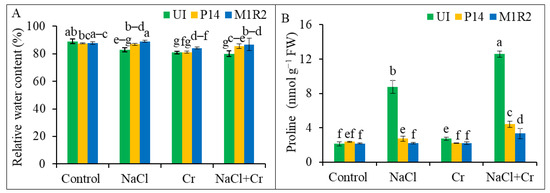 The application of NaCl, Cr, or their combination (NaCl + Cr) significantly reduced the RWC of rice plants by 7, 9, and 10%, respectively, compared to the uninoculated control (Figure 5A). However, inoculation with PGPR strains P14 and M1R2 mitigated these effects and improved RWC under all stress conditions. Notably, M1R2 showed the greatest enhancement, increasing RWC by 8, 5, and 9% under NaCl, Cr, and NaCl + Cr stress, respectively, relative to the corresponding uninoculated stressed plants (Figure 5A). Therefore, the increased water content in PGPR-inoculated plants may be attributed to their longer root systems, which play a key role in enhancing plant defence under stress conditions.