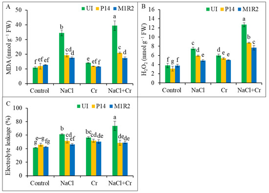 The MDA levels in rice leaves, a marker of lipid peroxidation and oxidative stress, were significantly elevated under NaCl, Cr, and NaCl + Cr stress conditions. In uninoculated plants, MDA levels increased by 219, 29, and 264%, respectively, compared to their corresponding controls (Figure 6A). Inoculation with PGPR strains P14 and M1R2 significantly reduced MDA accumulation under all stress conditions. Notably, the endophytic strain M1R2 was more effective than P14, reducing MDA levels by 49 and 56% under NaCl and NaCl + Cr stress, respectively, relative to the corresponding stressed controls. Under Cr stress, both strains performed similarly, showing no statistically significant difference in MDA reduction (Figure 6A). Our results suggest that inoculation with HMT-PGPRs reduces membrane lipid peroxidation, thereby protecting plants from oxidative stress induced by NaCl, Cr, and combined NaCl + Cr treatments.