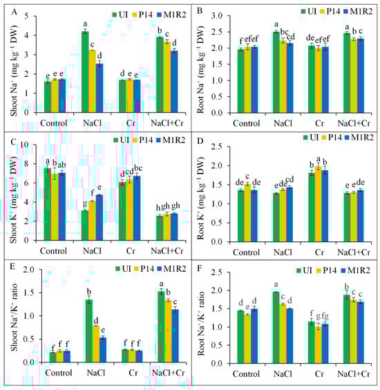 Exposure to NaCl and combined NaCl + Cr stress disrupted ion homeostasis in rice plants by significantly increasing Na+ accumulation and decreasing K+ levels in both shoot and root tissues. This imbalance resulted in a sharp rise in the Na+/K+ ratio by 630 and 716% in shoots, and by 134 and 128% in roots, respectively, compared to the control (Figure 7A–F). Inoculation with PGPR strains P14 and M1R2 significantly reduced shoot Na+ content and enhanced shoot K+ content under both NaCl and NaCl + Cr stress conditions, leading to a partial restoration of the shoot Na+/K+ ratio (Figure 7A,C,E). Both strains also lowered root Na+ levels under NaCl and NaCl + Cr stress (Figure 7B). While a slight increase in root K+ content was observed under NaCl stress following inoculation, no significant effect was found under NaCl + Cr stress (Figure 7D,F). Consequently, both strains contributed to a reduction in the root Na+/K+ ratio under NaCl and NaCl + Cr stress compared to uninoculated controls. The most pronounced improvement in ion homeostasis, particularly the reduction of the shoot Na+/K+ ratio, was observed with strain M1R2 under both NaCl and NaCl + Cr stress. However, neither P14 nor M1R2 had any significant effect on Na+, K+, or Na+/K+ ratios under Cr stress alone (Figure 7A–F). Thus, HMT-PGPRs effectively retain ion homeostasis, which is essential for maintaining plant growth under both NaCl and NaCl + Cr stress conditions.