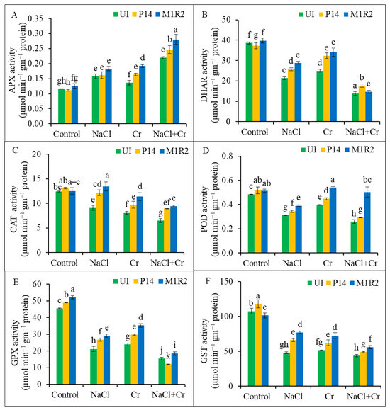 Rice plants exposed to NaCl, Cr, or combined NaCl + Cr stress showed a significant increase in APX activity, with the highest elevation (89%) observed under NaCl + Cr stress compared to control plants (Figure 8A). Inoculation with PGPR strains P14 and M1R2 further enhanced APX activity under all stress conditions, with M1R2 demonstrating superior performance compared to the respective uninoculated stressed plants. In contrast, DHAR activity declined significantly under NaCl, Cr, and NaCl + Cr stress by 45, 35, and 64%, respectively, relative to control plants (Figure 8B). However, inoculation with both PGPR strains markedly increased DHAR activity under all stress treatments, with M1R2 again showing the most pronounced enhancement. Similarly, CAT, POD, GPX, and GST activities were all reduced in uninoculated plants subjected to NaCl, Cr, or NaCl + Cr stress compared to unstressed controls (Figure 8C–F). Inoculation with either P14 or M1R2 significantly elevated the activities of these antioxidant enzymes under stress, with M1R2 consistently exhibiting greater improvement than P14. Therefore, PGPR-induced modulation of antioxidant capacity contributes to improved stress tolerance in plants.