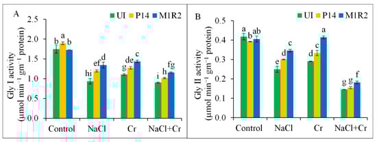 The activities of glyoxalase enzymes Gly I and Gly II were significantly reduced in rice plants exposed to NaCl, Cr, or combined NaCl + Cr stress, with the most pronounced reductions observed under NaCl + Cr stress by 49 and 66%, respectively, compared to the control plants (Figure 9A,B). However, inoculation with PGPR strains P14 and M1R2 significantly restored Gly I and Gly II activities under all stress conditions. Notably, strain M1R2 outperformed P14 by enhancing Gly I activity by 44, 30, and 28%, and Gly II activity by 39, 43, and 26% under NaCl, Cr, and NaCl + Cr stress conditions, respectively, compared to the corresponding uninoculated stressed plants. Our results suggest that PGPR strains are capable of modulating the glyoxalase system in rice.