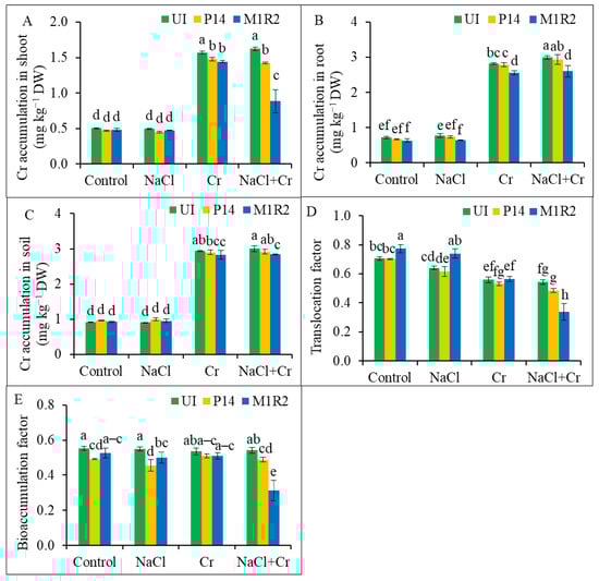 In this study, PGPR inoculation did not exert a significant effect on shoot and root Cr concentrations under normal or salt stress conditions. Across plant organs, Cr accumulation was consistently higher in roots than in shoots. Specifically, shoots accumulated 1.57 mg kg−1 and 1.62 mg kg−1, while roots accumulated 2.81 mg kg−1 and 2.99 mg kg−1 under Cr and NaCl + Cr stress, respectively, indicating preferential Cr accumulation in roots (Figure 10A,B). However, PGPR strains P14 and M1R2 were able to reduce shoot Cr concentrations under Cr stress by 6 and 8%, respectively. Under combined NaCl + Cr stress, these reductions were more pronounced, including 13% with P14 and 46% with M1R2 inoculation (Figure 10A,B). A similar trend was observed in root Cr accumulation. M1R2 reduced root Cr content by 9% under Cr stress and 13% under NaCl + Cr stress. In contrast, P14 showed no significant effect on Cr accumulation in roots under either condition.