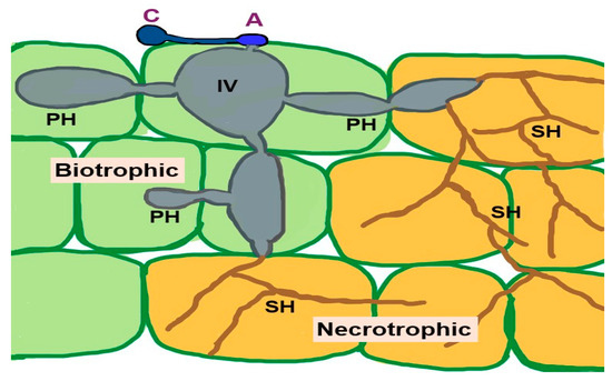 Colletotrichum fructicola infection on susceptible host plant. Biotrophic stage: Conidium (C) on the host plant germinate and produce an appressorium (A) that assists in the penetration of the host tissues and forms an infection vesicle (IV) and primary hypha (PH) in the living tissues. During this stage, the host cell maintains its structural integrity. The fungus then transitions to the necrotrophic stage by developing thin secondary hyphae (SH), colonizing and killing the surrounding tissues. The fungus produces cell wall degrading enzymes, proteases, and nutrient transporters to aid in tissue degradation and nutrient acquisition from the dead host cells [198].