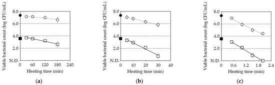 Decreases in the viable bacterial count of B. subtilis spores via post-heat treatments at 80 °C (a), 87 °C (b), and 100 °C (c) without and with MHHP treatment. The initial bacterial count of the untreated spore is indicated by “●”, and the MHHP-treated spore is indicated by “■” before post-heat treatment. The viable bacterial count of the untreated spore is denoted by “○”, and the MHHP-treated spore is denoted by “□” during post-heat treatment. The decreasing linear line of the untreated spore is indicated by the “dotted line”, and the MHHP-treated spore is indicated by the “solid line” during post-heat treatment. The plot and error bar show the mean and standard deviation calculated from the experimental data of three trials. N.D. means no detection level of viable bacterial count which was less than 1.0 log CFU/mL.
