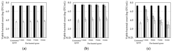 The pasteurization effect via MHHP treatment on B. subtilis of the untreated spore and pre-heated spore at 80 °C (a), 90 °C (b), and 100 °C (c). The viable bacterial count of the untreated spore is indicated by “■”, the pre-heat-treated spore is indicated by “■”, and the MHHP-treated spore is indicated by “□”. The plot and error bar show the mean and standard deviation calculated from experimental data of three trials. N.D. means no detection level of viable bacterial count which was less than 1.0 log CFU/mL.