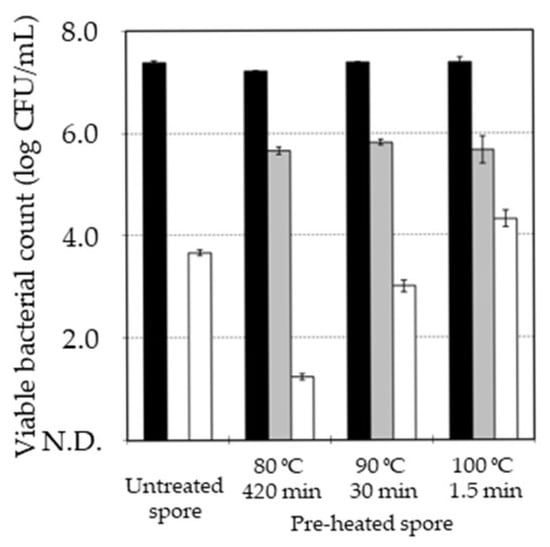 The viable bacterial count of the B. subtilis spore before and after MHHP treatment with and without pre-heat treatment at 80 °C for 420 min, 90 °C for 30 min, and 100 °C for 1.5 min. The viable bacterial count of the untreated spore is indicated by “■”, the pre-heat-treated spore is indicated by “■”, and the MHHP-treated spore is indicated by “□”. The plot and error bar show the mean and standard deviation calculated from experimental data of three trials. N.D. means no detection level of viable bacterial count which was less than 1.0 log CFU/mL.