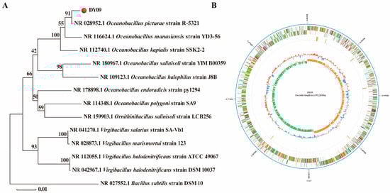 The results of whole-genome sequencing analysis of the DY09 strain. (A) Phylogenetic analysis of the DY09 strain. The phylogenetic tree was constructed based on the 16S rRNA gene sequence using the neighbor-joining method, and the reference sequences were downloaded from NCBI GenBank. (B) The whole-genome map of the DY09 strain.