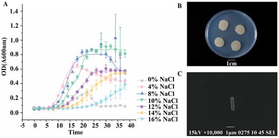 Soil samples were collected from the saline–alkali land in Dongying, Yellow River Delta. The samples were homogenized with sterile water at a 1:10 (w/v) ratio, followed by centrifugation at 6000 rpm for 5 min to collect the supernatant. The supernatant was inoculated into LB liquid medium containing gradient-increasing NaCl concentrations (2% to 10% w/v). Halotolerant bacteria were screened through serial subculture with progressively elevated salinity. The enriched bacterial suspension from the highest NaCl concentration (10% w/v) was subjected to serial gradient dilution (10−1 to 10−9) and spread onto LB solid medium supplemented with 10% NaCl. After 48 h of incubation at 30 °C, individual colonies were purified via streaking plate method to obtain target halotolerant strains. To investigate the salt adaptation mechanisms of the strain, the purified isolates were inoculated into LB liquid medium supplemented with varying concentrations of NaCl (0% to 16% w/v) and cultured under controlled conditions of 30 °C and 150 rpm in an orbital shaker. OD600 values were measured at 5 h intervals over a 40 h period. Growth curves were plotted using kinetic data, and the salt stress response characteristics of the strains were systematically analyzed.