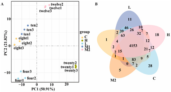 Results of gene quantitative analysis. (A) Venn diagram of co-expressed genes. (B) Two-dimensional clustering diagram of principal component analysis (PCA) among samples.