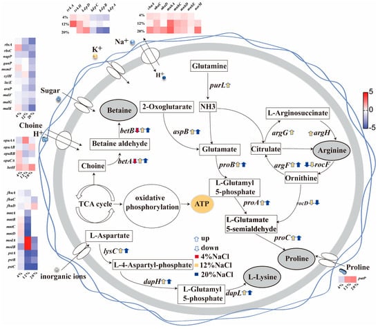 Schematic illustration of amino acid metabolism and membrane transport in strain DY09. For colored arrows, the direction indicates the upregulation or downregulation of gene expression, and the filled color reflects the expression under different salt concentrations, where red corresponds to 4% NaCl, yellow to 12% NaCl, and blue to 20% NaCl. The heat map reflects the differential expression profile (up-regulated genes are shown in red, down-regulated genes in blue, and no significant changes in white). For membrane transporters involved in salt-induced osmotic adaptation, please refer to Supplementary Table S4.