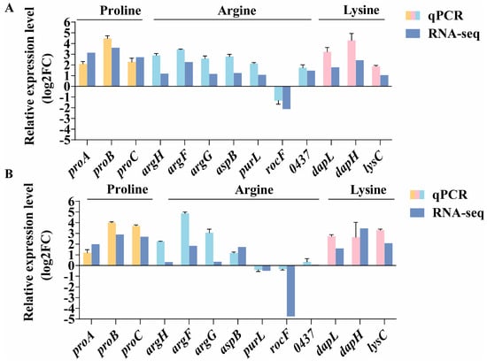 The role of amino acid metabolism in osmotic adaptation. (A) RNA-seq and qPCR results revealed the expression changes of genes related to proline, arginine, and lysine metabolism under 12% NaCl salt stress. (B) RNA-seq and qPCR results revealed the expression changes of genes related to proline, arginine, and lysine metabolism under 20% NaCl salt stress.