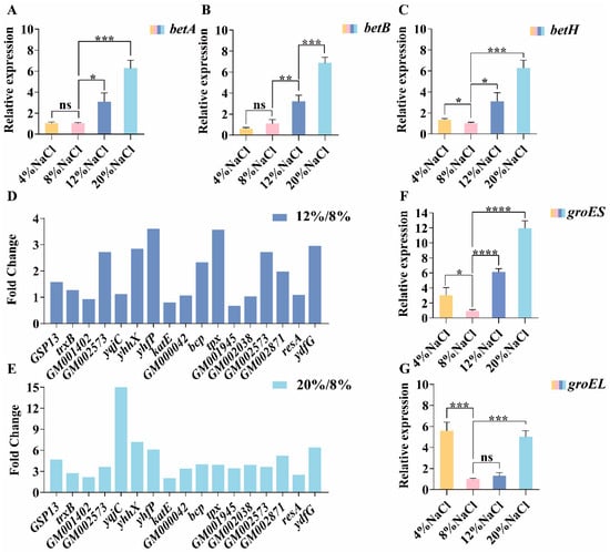 Differentially expressed genes (DEGs) involved in osmotic adaptation and oxidative stress. (A,B) qPCR of genes responsible for glycine betaine biosynthesis (betA and betB). (C) qPCR of genes representing those related to glycine betaine biotransport (betH). (D,E) Fold changes of differential genes representing those involved in oxidative stress conditions. (F,G) qPCR of heat-shock protein genes involved in heat-shock stress. In statistical significance annotation, the markers indicate: “ns”, p ≥ 0.05; “*”, 0.01 ≤ p < 0.05; “**”, 0.001 ≤ p < 0.01; “***”, 0.0001 ≤ p < 0.001; “****”, p < 0.0001.