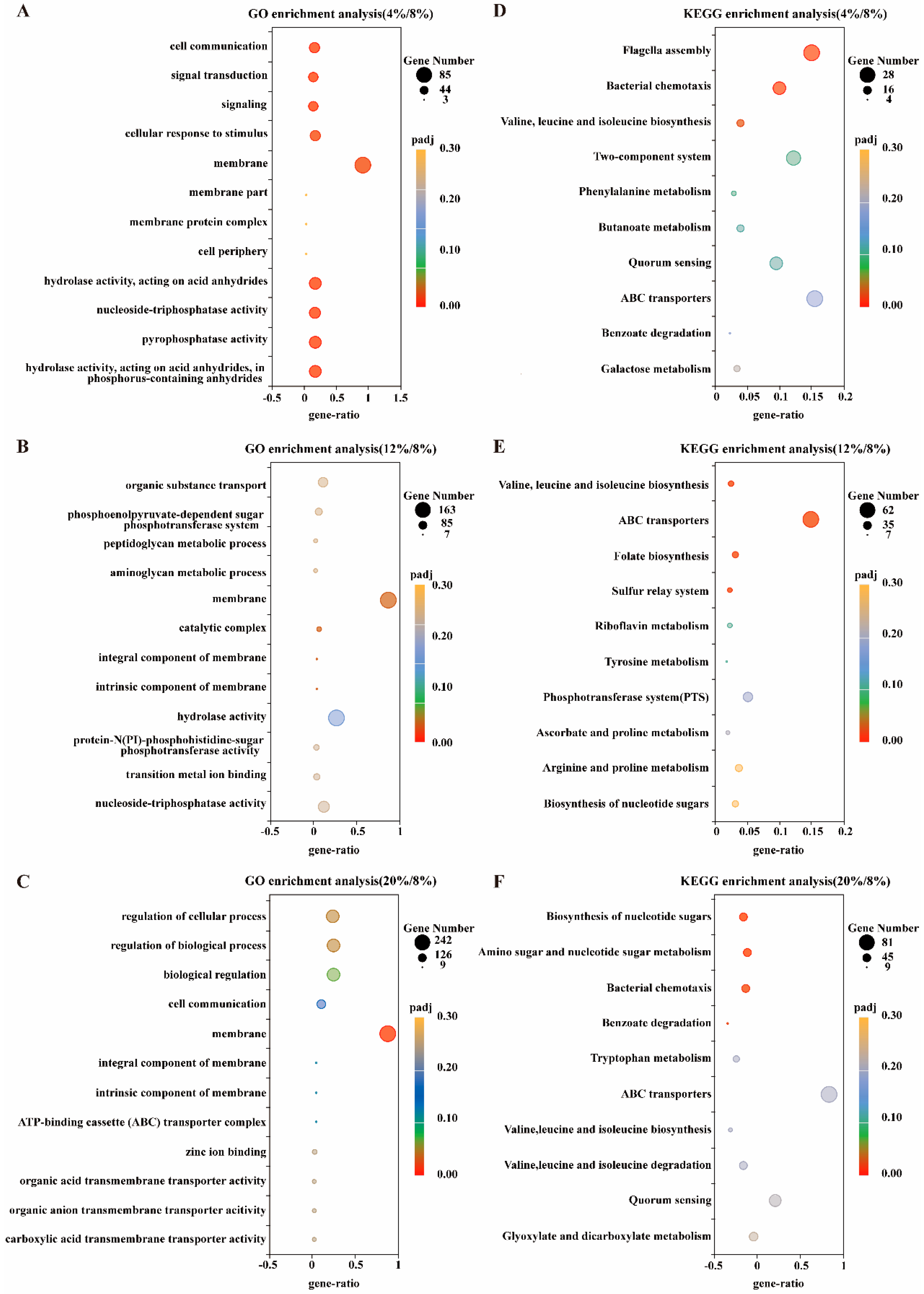 GO and KEGG enrichment analysis of the DEG set. (A) GO enrichment analysis of the DEG4%/8% set. (B) GO enrichment analysis of the DEG12%/8% set. (C) GO enrichment analysis of the DEG20%/8% set. (D). KEGG enrichment analysis of the DEG4%/8% set. (E) KEGG enrichment analysis of the DEG12%/8% set. (F) KEGG enrichment analysis of the DEG20%/8% set.
