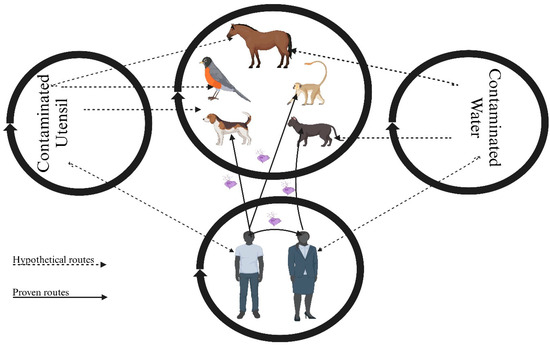 Transmission is defined as the passing of an infectious agent from one host to another. Direct transmission routes include physical contact, contact with a contaminated environment or surface, airborne transmission, and fecal–oral transmission. Indirect transmission routes involve another organism, such as an insect vector or intermediate host [50]. It has been postulated that T. tenax can be transmitted through kissing, saliva, droplet spray, using contaminated dishes and utensils, and drinking contaminated water [16,17,63,64,65]. However, these modes of transmission are predominately extrapolated from what is known about other Trichomonads, with fewer experimental studies confirming that these modes of transmission are similarly suitable for T. tenax. In an experimental study performed in 1928, Hinshaw was able to directly infect a dog with T. tenax, which was obtained from a human mouth with advanced periodontal disease [49]. Other researchers after him have also been successful in directly infecting the mouths of monkeys, cats, and even humans with T. tenax [66]. In one study, a researcher in the 1930s inoculated T. tenax into his mouth and was able to establish an infection for a period of 10 months [67]. Similarly, T. vaginalis is normally transmitted via direct host-to-host contact, predominantly through sexual intercourse in humans [61,68,69,70]. One study also reported that T. vaginalis has been successfully transplanted into the vagina of monkeys but not in other mammals such as cows, horses, pigs, dogs, cats, rabbits, guinea pigs, rats, and woodrats [66]. Trichomonas gallinae is mainly transmitted through direct host-to-host transmission between parents and young birds during feeding [71]. One mechanism of transmission common among T. tenax, T. vaginalis, and T. gallinae is via direct host-to-host contact, which should be taken into consideration to mitigate the spread of these parasites. In terms of transmission through contaminated utensils, also known as fomite transmission, there were no recorded scientific studies conducted on T. tenax that illustrated that the oral flagellate can be transmitted by this means. Fomite transmission of T. tenax is possibly an assumption and is still not fully understood. The same goes for both T. vaginalis and T. gallinae; most studies assume or hypothesize that there is a strong possibility that these Trichomonads can be transmitted via fomites, but this too is not fully understood [69,72,73]. It has also been hypothesized that T. tenax can be transmitted via contaminated water. However, phylogenetic analyses based on the 16S ribosomal RNA (rRNA) gene suggest that Trichomonads are ancestral eukaryotic organisms [74]. According to M. Lopez and C Hall (2020), when eukaryotic cells are placed in water or hypotonic solutions, they get swollen and then rupture, a process known as cytolysis [75]. Additionally, based on cultural studies conducted on T. tenax, it has been shown that these Trichomonads require some form of serum for growth and survival [12,20,48]. Therefore, more studies on the transmission of T. tenax via contaminated water are needed to confirm this assumption (Figure 1). A study on the survival of T. gallinae in saline, water, and both dry and moist bird seeds was conducted; the study found that T. gallinae can survive for up to 168 h in saline and moist bird seeds but did not survive in water or dry bird seeds regardless of parasite density [72]. Trichomonas vaginalis has been reported to survive outside the human body in a wet environment for more than 3 h, suggesting that it can possibly be transmitted via contaminated water [73]. However, this mechanism of transmission is still not fully understood, and more studies are needed to confirm these hypotheses. The transmission of T. tenax involves several possible mechanisms within and between host populations; understanding these mechanisms can inform disease control strategies aimed at mitigating the spread of the parasite.