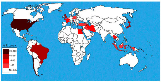 Color-coded world map highlighting regions where highest T. tenax prevalence in humans has been reported.