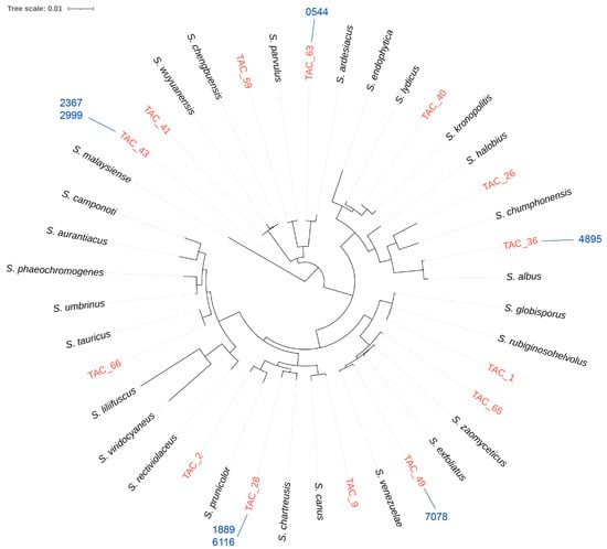 Phylogenetic analysis based on 16S rRNA sequences of 14 isolated Streptomyces strains and their closely related reference strains. The corresponding sequences are provided in File S2, and the reference strain information is listed in Table S2 (File S1). TPSs selected for further study are annotated in blue alongside the corresponding strains.