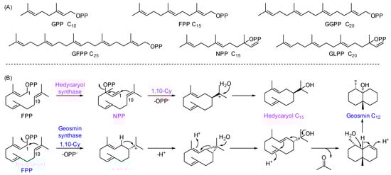 - Dickschat, J.S. Bacterial terpene cyclases. Nat. Prod. Rep. 2016, 33, 87–110. [Google Scholar] [CrossRef]