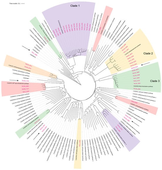 Phylogenetic analysis of 48 TPSs identified from the 14 strains, together with functionally characterized reference TPSs. The corresponding sequences of the 48 TPSs are provided in the Supplementary File S3. TPSs showing low sequence identity to characterized reference TPSs are indicated by arrows.