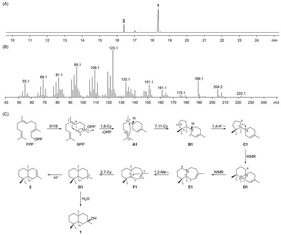 GC-MS analysis of the product generated by 6116 and its proposed biosynthetic mechanism. (A) Total ion chromatogram (TIC) of products from 6116 incubated with FPP. (B) Electron ionization (EI) mass spectrum of 1. (C) Proposed biosynthetic pathway of compounds 1 and 2 catalyzed by 6116.