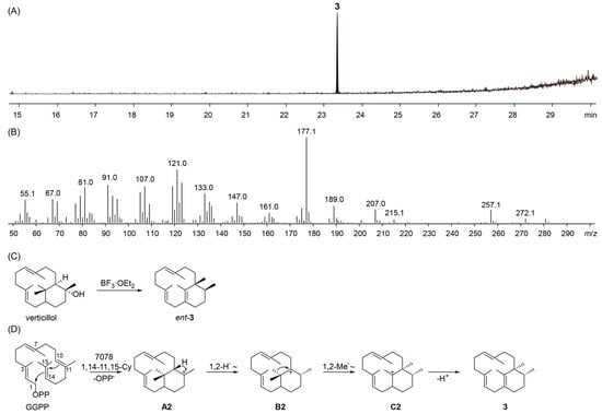 GC-MS analysis of the product generated by 7078 and its proposed biosynthetic mechanism, in comparison with the chemical synthesis route of ent-3. (A) Extracted ion chromatogram (EIC) at m/z 177, corresponding to the base peak of 3 in the EI mass spectrum. (B) EI mass spectrum of 3. (C) Chemical synthesis of ent-3 from verticillol using BF3·OEt2 as a catalyst. (D) Proposed biosynthetic pathway of compound 3 catalyzed by 7078.