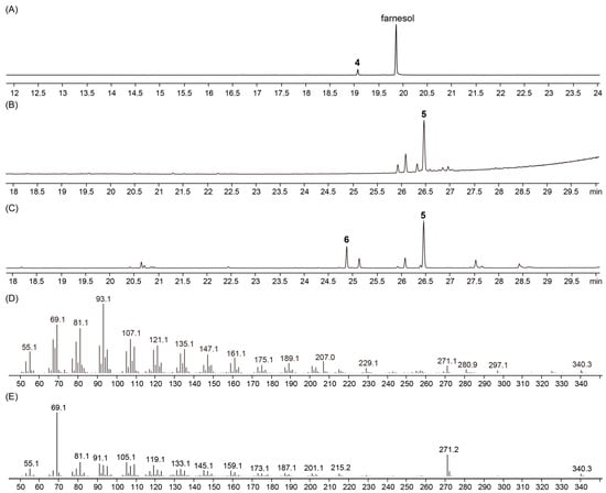 GC-MS analysis of the products generated by 2367 and 2999. (A) TIC of the products from 2367 incubated with FPP. (B) TIC of the products from 2999 incubated with GFPP. (C) TIC of the fermentation products from E. coli harboring 2999. (D) EI mass spectrum of 5. (E) EI mass spectrum of 6.