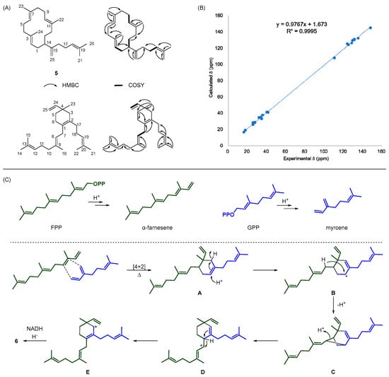 Through comprehensive analysis of one- and two-dimensional NMR spectra, along with their MS spectra (Figure 6D,E), the structures of 5 (File S1, Figures S9–S15) and 6 (File S1, Figures S16–S22) were elucidated (Figure 7A, Table 2). The structure of 5 has previously only been reported in the context of chemical synthesis [42], and has not been isolated from natural sources. Given its monocyclic structure, it is likely derived from the 1,14-cyclization of GFPP followed by deprotonation to yield the final product. In contrast, compound 6 represents a novel structure whose formation cannot be rationalized by conventional cyclization pathways from GFPP. Due to its unusual structure and the significant overlap of multiple signals—which made certain signals difficult to distinguish in the HSQC and HMBC spectra (e.g., δC 131.22 and 131.17, δC 17.77 and 17.76)—we performed density functional theory (DFT)-based NMR calculations to verify the correctness of the structure (File S1, Table S3, Files S4 and S5). As shown in Figure 7B, the calculated NMR data exhibited an excellent linear correlation with the experimental results (R2 = 0.9995), strongly supporting the structural assignment of 6. In consideration of the close phylogenetic relationship between strain TAC43 and S. malaysiensis, compound 6 was therefore designated as sestermalaysiene. Given its unique structure, its formation is proposed to involve a [4 + 2] cycloaddition between myrcene and farnesene [43], both of which might be generated during the fermentation process under high precursor supply (Figure 7C). During the E. coli fermentation, acetic acid may accumulate, promoting the pyrophosphate elimination from FPP and GPP to yield farnesene and myrcene, respectively. These two precursors could then undergo a [4 + 2] cycloaddition under the fermentation conditions to form intermediate A. Subsequently, under acidic conditions, intermediate A may be protonated to generate cation B, which could rearrange via intermediate C to form cation D. Cation D might then undergo a hydride shift coupled with double bond migration, leading to intermediate E. This intermediate could accept a hydride ion from NADH, yielding the final product 6. The formation of this product appears to require a specific microenvironment to facilitate the complex reaction sequence. Nevertheless, the low specific optical rotation of compound 6, [α] = −1.6 (c 0.13, CH2Cl2), suggests that the product is likely a racemic mixture, implying that the entire process could be non-enzymatic.