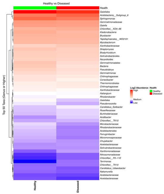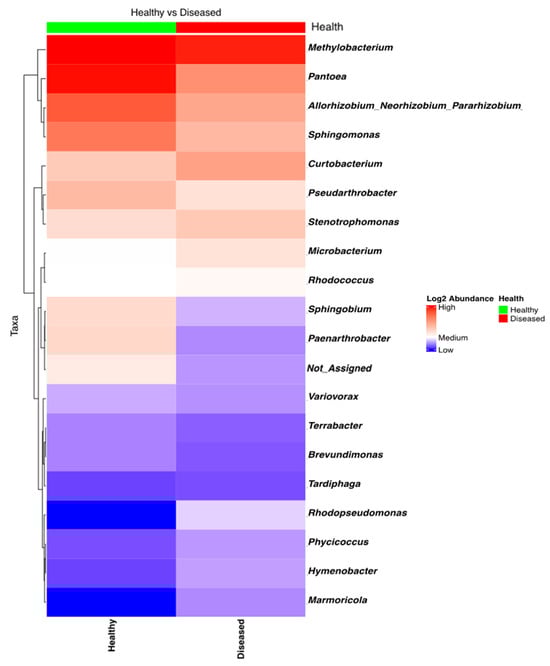 Analysis of the heatmap and the bar plot showing the bacterial taxa composition in the soil samples collected from the proximity of diseased- and healthy-looking plants revealed a high abundance of taxa, with a limited number of differences between the two conditions (Figure 1 and Figure S2).