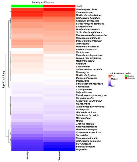 The fungal community in soil found in the proximity of both diseased and healthy plants was rich and diverse, with many taxa present. In particular, taxa such as Trichoderma, Mortierella, and Gibellulopsis piscis (=Gibellulopsis nigrescens, former Verticillium nigrescens) [30,31] were most frequent (Figure S4). Several other genera, comprising species that influence potato health, were also found to have high relative frequencies in several samples, such as Verticillium, Fusarium, Colletotrichum, Alternaria, and Gibellulopsis. A heatmap analysis showed that Fusarium oxysporum, which can cause wilting and dry rot in potatoes, was quite abundant in all soil samples, while Alternaria alternata, which causes brown spots on potatoes, was found to be more prevalent in the soil samples collected close to the diseased plants. An opposite trend, being more abundant in soil close to healthy plants, was observed in the case of another potato pathogen, namely C. coccodes, which is responsible for black dot disease (Figure 2). However, none of these differences were found to be statistically significant.
