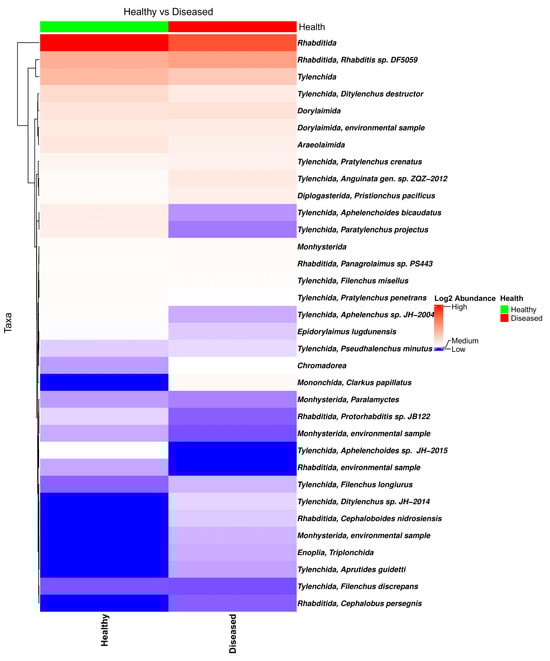 Heatmap of the nematode composition in soil samples collected from the proximity of diseased- and healthy-looking potato plants. NGSI data.