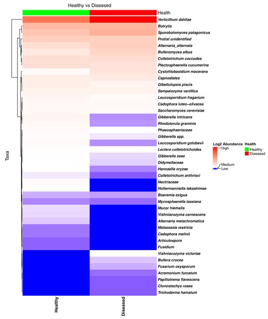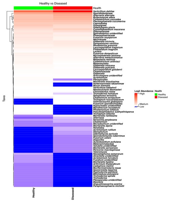 Heatmap of the fungal taxa found in the potato stems of diseased- and healthy-looking plants. NGSI data.