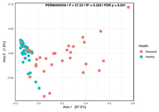 A Kruskal–Wallis pairwise comparison test on the Shannon alpha diversity indicated that significant differences occurred between the healthy and diseased groups (p = 0.00452). The beta diversity plot, generated using the weighted UniFrac distance metric, revealed a clear separation of the two groups, suggesting a strong differentiation related to the health status of the plant (Figure 6).