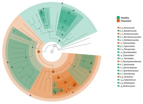 Differential abundance analysis used linear discriminant analysis effect size (LEfSe) [28] via the microeco package [29]. The phyloseq2meco() function from microeco was used to convert the phyloseq object into a format compatible with LEfSe analysis. The trans_diff$new() function was then applied to perform the LEfSe test, using the health status of the plant (healthy vs. diseased) as the grouping variable. Significantly different genera were identified with an LDA score > 2.0 (p = 0.05). Results were visualized as cladograms depicting taxonomic relationships from phylum to genus, highlighting significant biomarkers by health status.