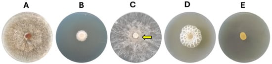 Microbial interaction assays. (A) S. rolfsii was grown in a PDA medium. (B) S. rolfsii was grown in the presence of bacterial VOCs, where mycelial growth was affected. (C) K. cowanii Ch1 grew around the mycelial disk in the absence of bacterial VOCs and (D) K. cowanii Ch1 grew around the mycelial disk in the presence of bacterial VOCs. The arrow in (C) indicates that S. rolfsii has outgrown the bacterial colony in the absence of VOCs, while in the presence of VOCs (D), gas bubbles were produced by K. cowanii Ch1. (E) As a control, the bacterial colony was grown in the presence of VOCs. The images were taken at 72 h.