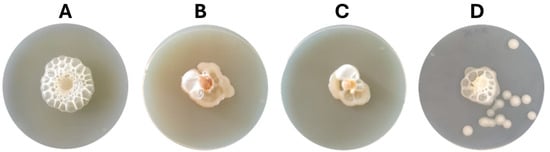 The fungal strains evaluated were Sclerotium rolfsii and Alternaria alternata, both of which present mycelial growth inhibition in response to the VOCs produced by K. cowanii Ch1, as well as Fusarium oxysporum, which presents VOC resistance in previous work [11]. These fungal strains were provided and identified by their morphological characteristics by the Laboratory of Plants and Agriculture Bio-technology at Queretaro University, Mexico. The fungal strains were grown in a potato dextrose agar (PDA) medium (Difco Laboratories, Detroit, MI, USA) and incubated at 28° for 5–7 days as per the requirements of each specific fungal strain. The bacterial strain used was K. cowanii Ch1 [11], and the bacterial strains used as controls for VOC production were Bacillus altitudinis CH05 [19], Bacillus tropicus CH13 [19], and Pectobacterium aroidearum SM2 [2], which were grown in a TSA medium (Difco Laboratories, Detroit, MI, USA) at 37 °C. For bacterial–fungal interaction assays, a double-compartment Petri dish chamber (9 cm) was used [11]. For the treatments, the lower part of the compartment was inoculated with 100 µL of each bacterial strain (1 × 108 CFU/mL) in the TSA medium (Difco Laboratories, Detroit, MI, USA) for VOC production, while in the upper compartment, the PDA medium (Difco Laboratories, Detroit, MI, USA) was inoculated with fungal strain disks (with a diameter of 7 mm). Around these fungal disks, 20 µL (1 × 108 CFU/mL) of K. cowanii Ch1 was inoculated. For the treatments without VOC production, the PDA medium (Difco Laboratories, Detroit, MI, USA) was inoculated with fungal strain disks, and 20 µL (1 × 108 CFU/mL) of K. cowanii Ch1 was inoculated around each of these fungal disks, while the lower compartment was not inoculated with any bacterial strains, such that VOC production was absent in that compartment. For the controls, each fungal disk and K. cowanii Ch1 (in the upper compartment) were grown with or without the production of bacterial VOCs (in the lower compartment). All double-compartment Petri dish chambers were sealed with parafilm and incubated at 28 °C, and measurements of the radial mycelial growth were performed every 24 h.