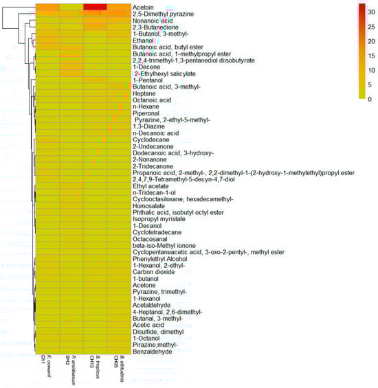 We compared the VOCs produced at 24 h by the bacterial strains to identify some common molecules (Figure 4 and Table S1). A total of 53 compounds were detected and plotted in Figure 4, which were classified as alcohols (18.10%), aldehydes (7.56%), acids (16.50%), pyrazines (15.28%), ketones (7.87%), hydrocarbons (7.44%), thiols (1.13%), and other compounds (24.75%). The molecules with a high relative abundance in B. tropicus CH13 were acetoin (32.77%), 2,5-Dimethyl pyrazine (12.33%), 2,3-Butanedione (10.38%), and Nonanoic acid (6.53%); in B. altitudinis CH05 were 2,5-Dimethyl pyrazine (13.31%), Acetoin (11.9%), Nonanoic acid (6.72%), and 3-methyl-1-Butanol (4.43%); in P. aroidearum SM2 were 2-Ethylhexyl salicylate (5.65%), 2,5-Dimethyl pyrazine (4.99%), 1-Decene (4.93%), and Butanoic acid, butyl ester (4.25%); and in K. cowanii Ch1 were acetoin (13.52%), 2,5-Dimethyl pyrazine (6.47%), Ethanol (5.56%), and 3-methyl-1-Butanol (4.85%). Based on the profiles of the VOCs and whether some of them can cause oxidative stress in S. rolfsii, we decided to use acetoin, 2,5-Dimethyl pyrazine, ethanol, cyclododecane, and benzaldehyde to test the bacterial–fungal interactions as above, but the phenotypical response in K. cowanii Ch1 was not observed; thus, the complex mixture of VOCs probably had multiple targets in the cells to cause oxidative stress (Figure S1).