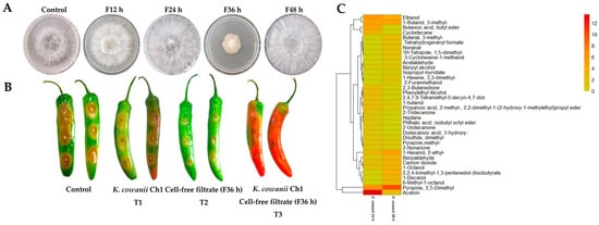The in vitro and in vivo evaluation of cell-free filtrates. Cell-free filtrates obtained at 12, 24, 36, and 48 h of bacterial growth were added during fungi–bacteria interaction (A). (B) Colonization competence between both microorganisms was evaluated in chili fruits (T1). Cell-filtrate obtained at 36 h was evaluated against S. rolfsii (T2) and T3 is the co-inoculation of both microorganisms treated with the cell-free filtrates (F36 h). Control was inoculated only with S. rolfsii. Results in (A) were recorded on the 5th day of mycelial growth, and results in (B) were recorded on the 4th day of the experiment. (C) A comparison of VOC profiles produced at 24 h and 36 h in K. cowanii Ch1. The bar color represents the relative abundance based on the relative peak area (%) detected in the HS-SPME-GC-MS analysis.