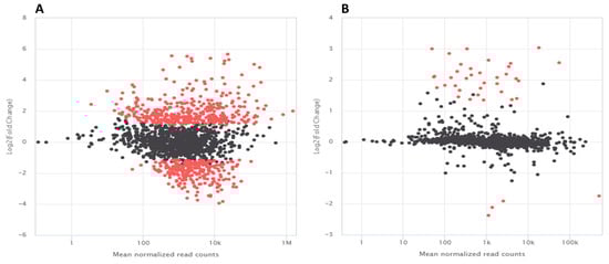 The MA plot visualization of differential gene expression in K. cowanii Ch1. Differentially expressed genes in pairwise comparisons during bacterial–fungal interactions in the absence of VOCs (A) and in the presence of VOCs (B). These conditions were compared with K. cowanii Ch1 grown in the absence of VOCs as a control. Expression levels are shown on X-axis, while log2 of fold changes are shown on Y-axis. Red dots represent differentially expressed genes (adjusted p-values of <0.05). Black dots represent non-differentially expressed genes. The shrinkage of effect size was carried out using the ‘ashr’ method in DESeq2.