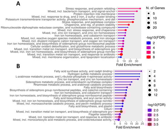 Following these routes of the oxidative stress defense system and the activation of diverse genes by these key transcriptional regulators, diverse pathways were observed (Figure 7A). Some of them were related to the siderophore-mediated iron transport, and these genes were upregulated with a >1.5-fold change, such as entCF that encodes synthetases for the biosynthesis of enterobactin. Enterobactin recognition and transport are represented by upregulated genes such as fepBCD, tonB, exbBD, and fes. Additionally, the ferrous iron transport system was represented by upregulated genes such as feoAB. Genes that encode for oxidative enzymes were upregulated with a >1.5-fold change and included 2-Oxobutyrate oxidase (ID QU629_RS16930), Ferric reductase (fhuF), Alkyl hydroperoxide reductase protein C (ahpC), NAD-dependent glyceraldehyde-3-phosphate dehydrogenase (gapA), Peptide-methionine (S)-S-oxide reductase (msrA), Ribonucleotide reductase of class III (nrdG), Thiol peroxidase (tpx), Oxidoreductase (ID QU629_RS03245), and other important genes (Table S2). The genes upregulated with a >1.5-fold change that prevented protein misfolding and aggregation were represented by the multiple stress resistance protein BhsA (bhsA), 16 kDa heat shock protein AB (ibpAB), heat shock protein GrpE (grpE), chaperone protein ClpB (ATP-dependent unfoldase) (clpB), chaperone protein DnaJK (dnaJK), heat shock protein 60 kDa family chaperone GroEL (groL), and HtrA protease/chaperone protein (degP). The cellular oxidant detoxification and glutathione metabolic process pathways were represented by Glutathione S-transferase (gstA), Thioredoxin 2 (trxC), and Glutaredoxin-like protein NrdH (nrdH). Endonuclease IV was upregulated with a 5-fold change. Downregulated genes related to important transporters, membrane proteins, motility, signal regulation, and metabolism were detected (Table S4).